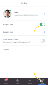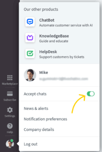 Możesz zacząć przyjmować rozmowy tuż po zalogowaniu się do narzędzia LiveChat. Oznacza to, że gdy Klienci wejdą na czat na Twojej stronie, zostaną do Ciebie przypisani i będziecie mogli prowadzić rozmowę. W przypadku gdy chcesz się skupić na ustawieniach aplikacji, a rozmowy nie zostały przypisywane Tobie, wyłącz status przyjmowania czatów oznaczony jako “Accepting chats”.
