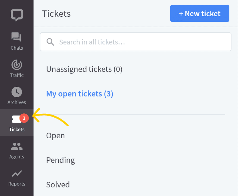 W takich godzinach okno czatu zmieni się w formularz, który umożliwi odwiedzającym przesyłanie wiadomości, czyli ticketów. Tickety są odpowiednikami wiadomości e-mail, mają jednak krótszą formę. Pozostawione przez Klientów wiadomości możesz sprawdzić zakładce “Tickets”, która znajduje się na pasku po lewej stronie aplikacji.